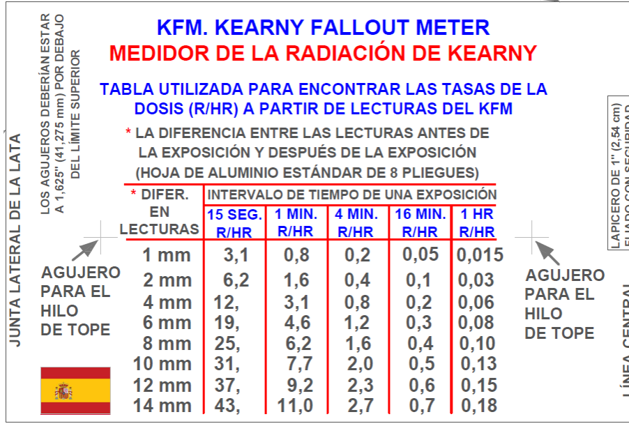 Etiqueta colocada en el KFM con la explicación de las tasas de la dosis en función de las diferencias de separación de las hojas de aluminio